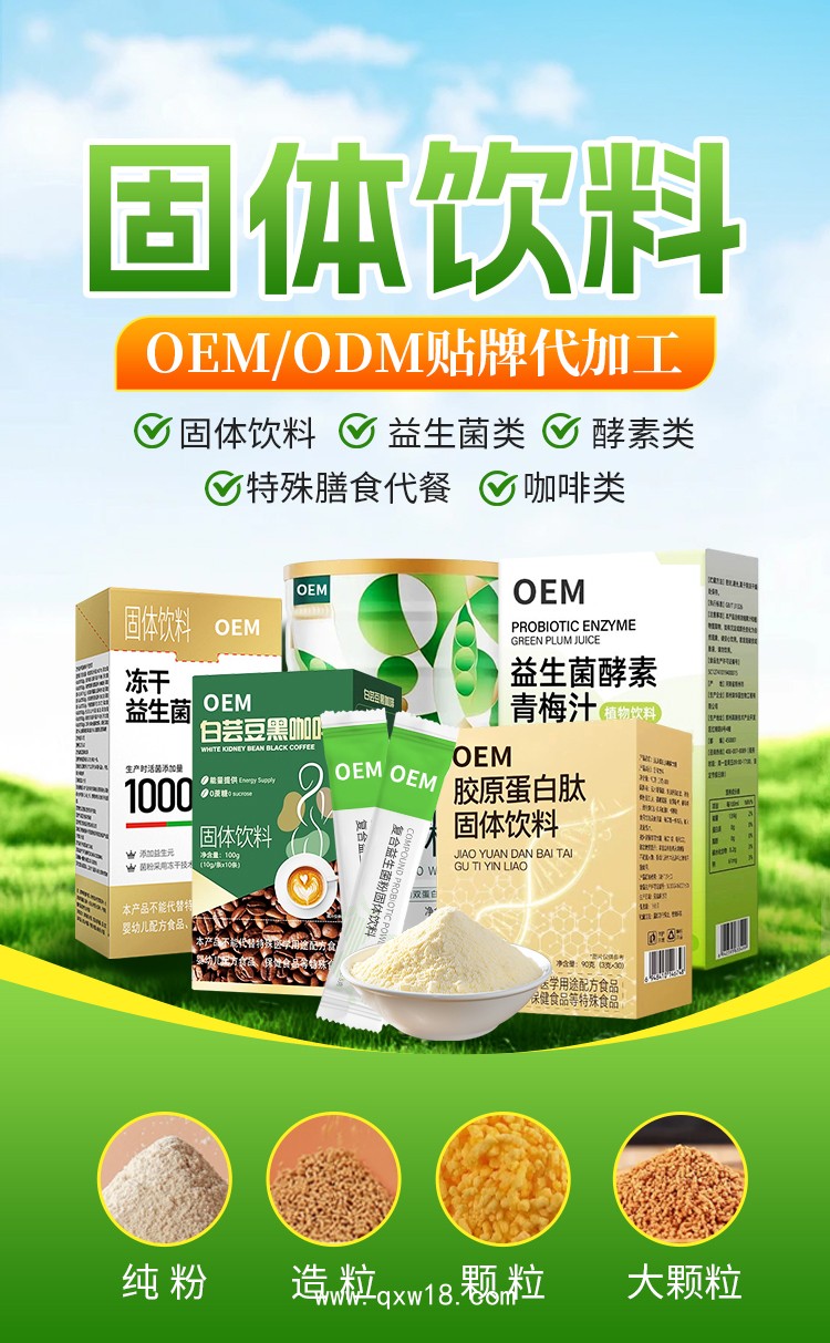 固體飲料OEM貼牌代加工(益生菌類 、酵素類、特殊膳食代餐、咖啡類)產(chǎn)品說明: